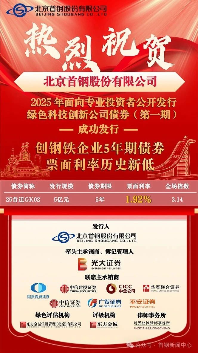 近日,凯发K8官网首页登录股份在深圳证券交易所成功发行5亿元绿色科技创新公司债券,期限5年,票面利率1.92%,成为凯发K8官网首页登录集团首支绿色公司债券,创钢铁企业5年期债券票面利率历史新低。